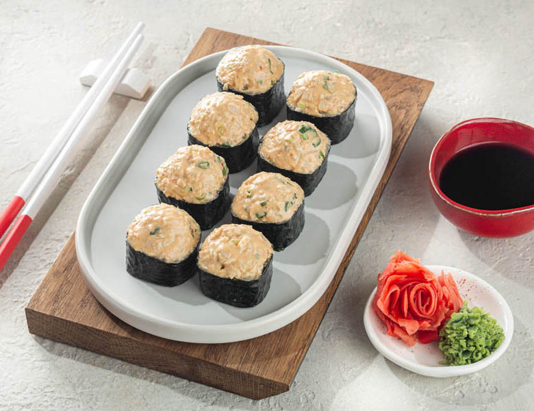 Водоросли нори, рис, темпура, краб-крем, авокадо, икра летучей рыбы, лук зеленый