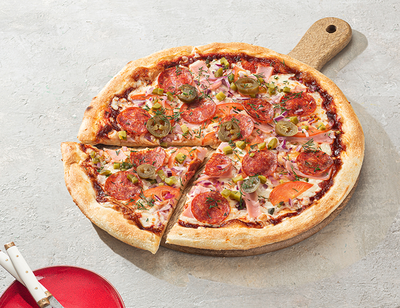 Для тех, кто предпочитает острые впечатления! Соус барбекю, сыр моцарелла, красный лучок, томаты, маринованные огурчики, зелень, нежная ветчина в сочетании с пепперони и ...